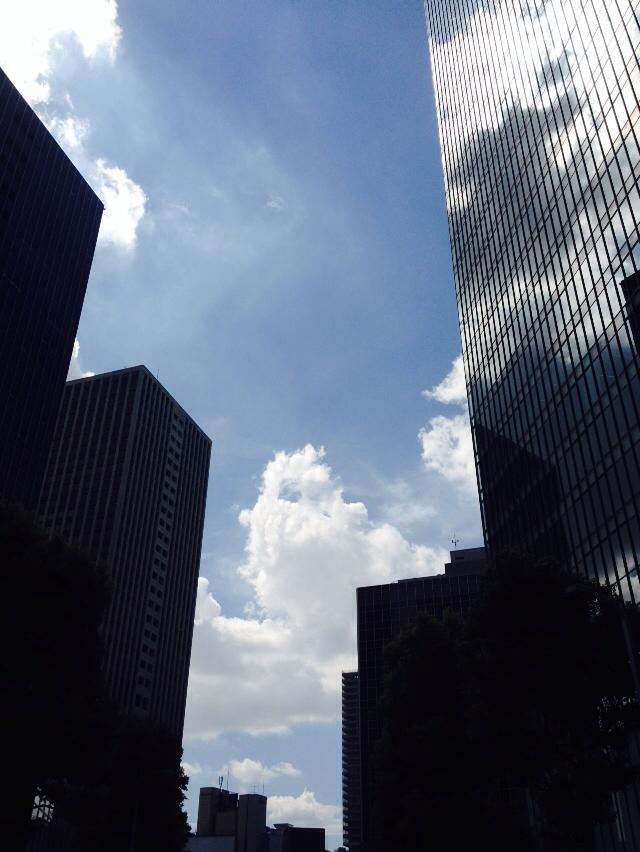 朝、見上げたらビルとビルの間に夏の雲。
